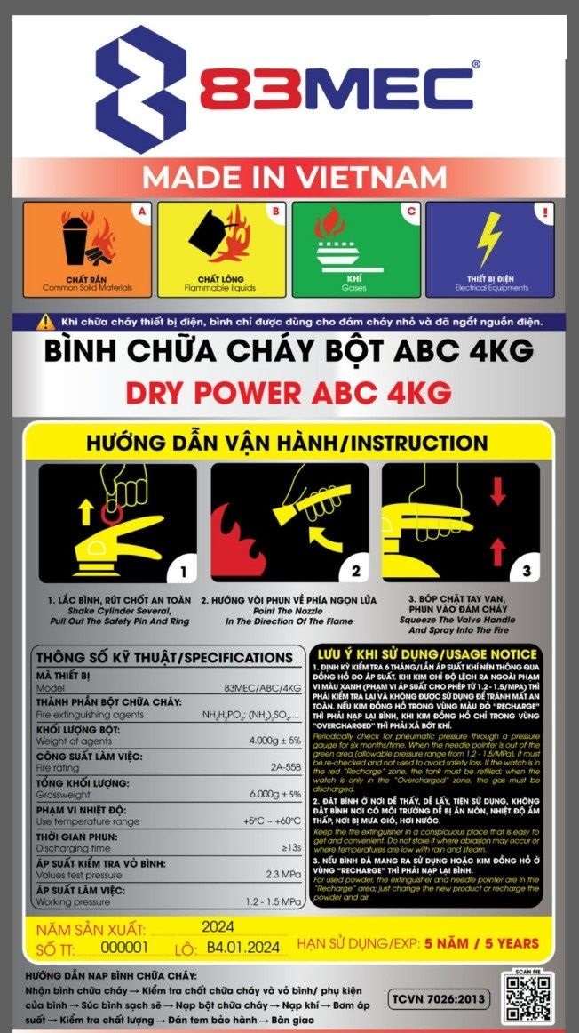 | Xuất xứ Bình chữa cháy bột ABC 4KG 83MEC – BQP có kiểm định | Made in Việt Nam |