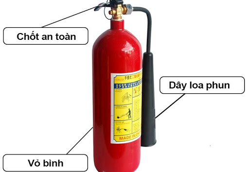 – Bình chữa cháy khí CO2 3kg MT3 gồm 5 bộ phận chính đó là vỏ bình; cụm van, chốt hãm; ống dẫn khí; vòi phun; tay cầm. Ngoài ra bên trong bình còn một số các chi tiết nhỏ khác như ty, ốc, ống dẫn khí,…