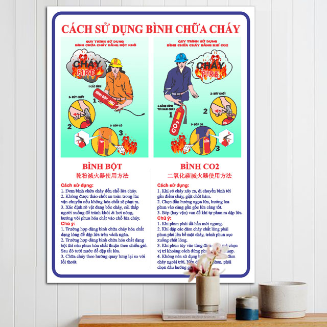 - Dễ dàng nhận diện: Với hình ảnh minh họa sinh động và nhiều màu sắc, bảng giúp dễ dàng tiếp thu và hiểu các bước hướng dẫn sử dụng bình chữa cháy.