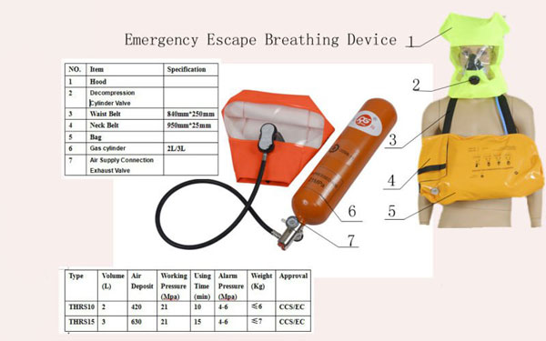 Bộ bình thở 4 món (mặt nạ, mõm thở, quay đeo, bình khí) chuyên dùng trên tàu EEBD TH/15-1 được đặt tại các khu vực khác nhau trên tàu, tuân theo chương 3 Bộ luật quốc tế về các hệ thống an toàn chống cháy (FSS Code).