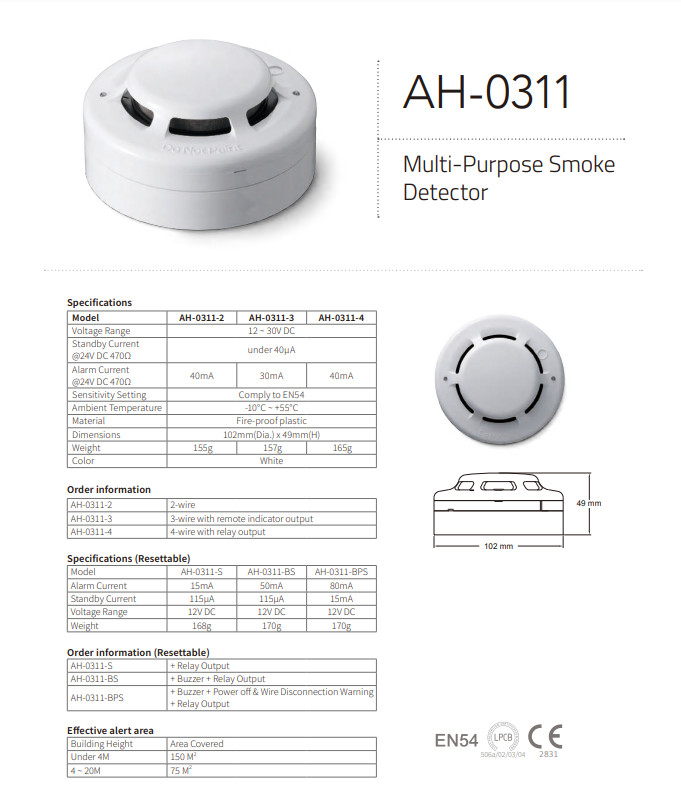 ✔️ Thông số kỹ thuật Đầu báo khói 2 dây 12V AH-0311-4 Horing