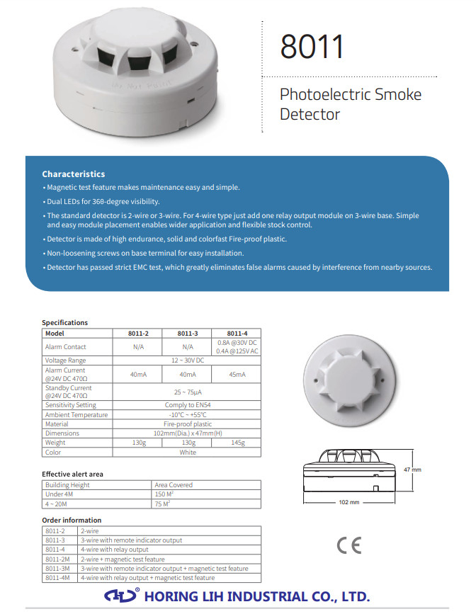 - Đầu báo khói quang 2 dây 24V 8011-2 Horing Detector được làm bằng cao độ bền, vững chắc và Colorfast nhựa chống cháy.