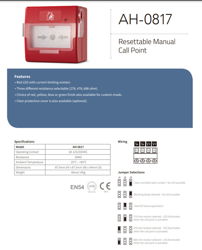 + Nút ấn khẩn vuông reset Horing AH-0817 chất liệu tốt làm từ vật liệu chống cháy. Thích hợp với nhiều hệ thống báo cháy. Sản phẩm có 2 loại có nắp chụp bảo vệ và không có nắp chụp bảo vệ có thể lựa chọn phù hợp.