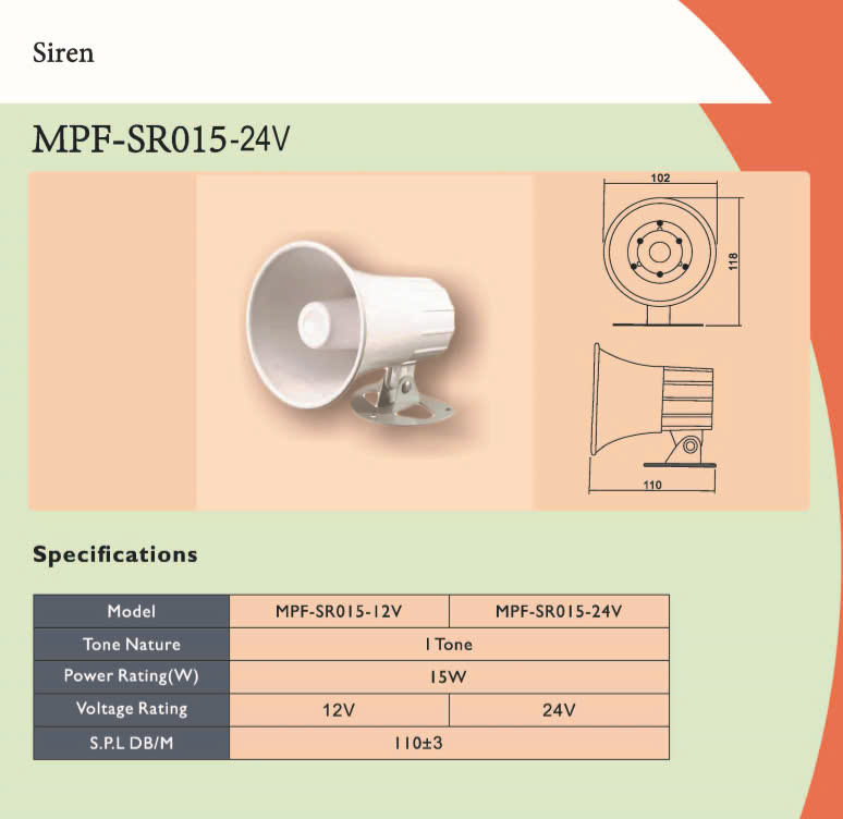 Còi loa 24V MPF-SR015-24V Taiwan được trang bị trong PCCC tại các cơ sở đông người có nguy cơ cao xảy ra cháy nổ. Ngoài ra, chúng còn sử dụng trong các trường hợp khẩn cấp báo động, báo trộm và nhiều các trường hợp khác rất hiệu quả để báo động cho