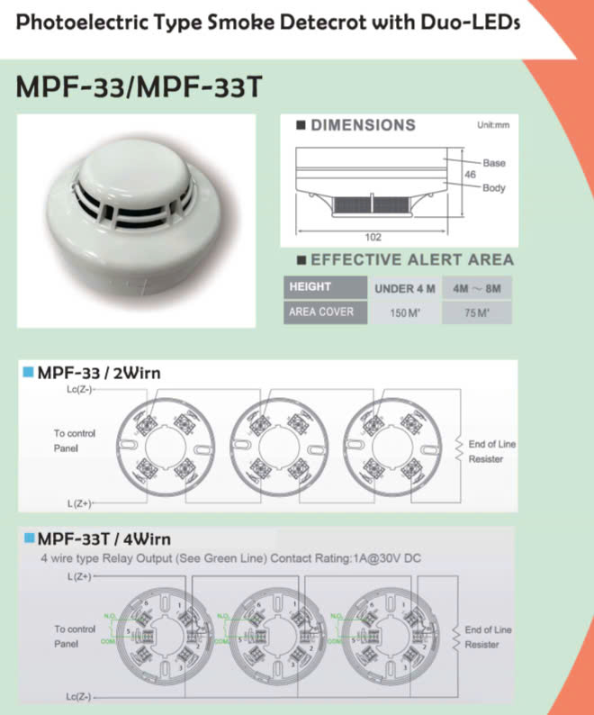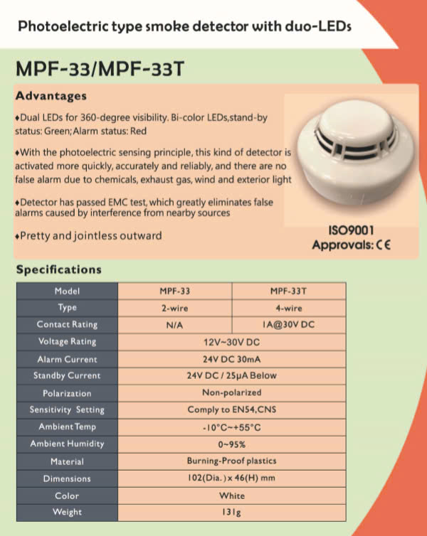 - Điện áp hoạt động Đầu báo khói 12V Taiwan MPF-33T: 12 - 30VDC