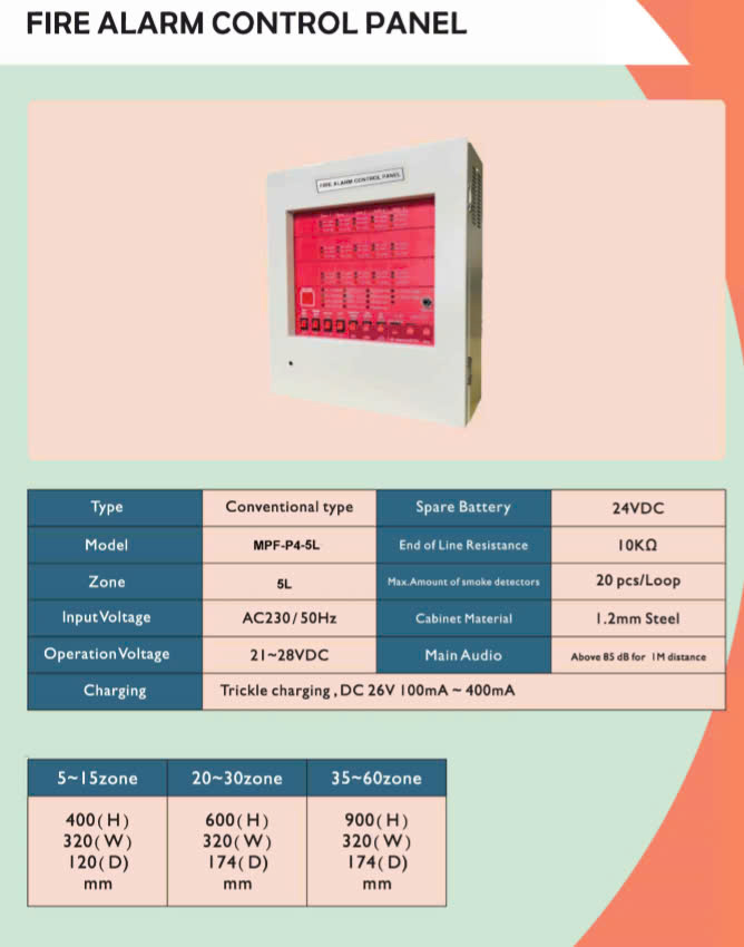 - Kích thước Tủ trung tâm báo cháy 5 kênh MPF-P4-5L Taiwan: 400mm x 320mm x 120mm