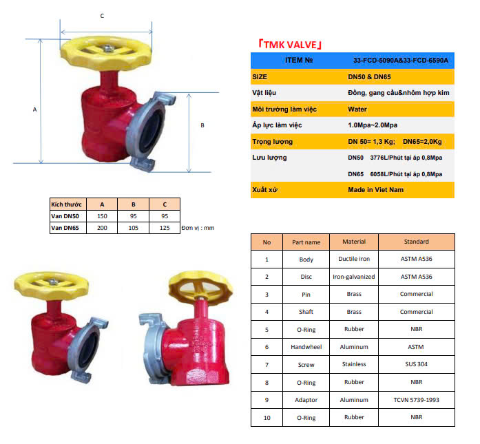 | Van gang D65 | Màu đỏ hoặc màu bạch kim | Gang xám | 6058L/Phút tại áp 0,8Mpa | 2.0Mpa | 12 tháng |