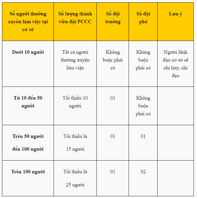 Đội phòng cháy và chữa cháy cơ sở hoạt động theo chế độ không chuyên trách được tổ chức và biên chế tùy theo số người thường xuyên làm việc tại cơ sở đó, cụ thể được trình bày theo bảng sau: